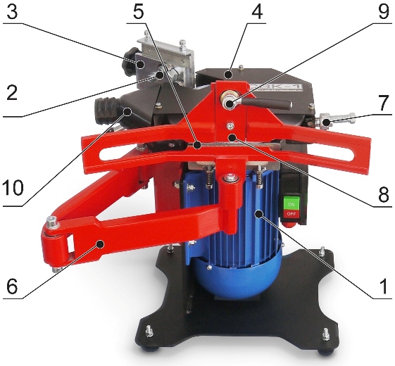 1 - электродвигатель, 2 - оснастка для радиусной правки кромки диска, 3 - алмазная игла для радиусной правки кромки диска, 4 - защитный кожух, 5 - пластина поддержки лезвия, 6 - поворотный рычаг держателя конька, 7 - алмазный карандаш для плоскости, 8 - рамка держателя, 9 - кулачковый зажим, 10 - патрубок для подключения системы пылеудаления.